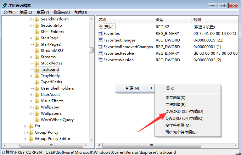 2、在“注册表编辑器”窗口中,依次展开“HKEY_CURRENT_USER--Software--Microsoft--Windows--CurrentVersion--Explorer--Taskband”,然后在右侧空白处点击鼠标右键,在弹出的菜单中依次选择“新建--DWORD(32-位)值”,并将其命名为“MinThumbSizePx”;