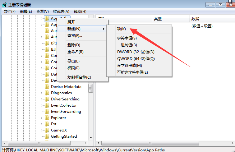2、来到“注册表编辑器”窗口后,依次展开“HKEY_LOCAL_MACHINE--SOFTWARE--Microsoft--Windows--CurrentVersion--App Paths”,然后在App Paths项目上单击鼠标右键,在打开的菜单中依次选择“新建--项”,并将命名为“MSConfig”;
