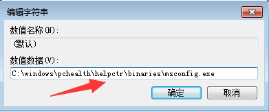 3、接着在右侧窗口中,对着“默认”的字符串值双击打开“编辑字符串”窗口,将“数值数据”设置为“C:\Windows\PCHealth\HelpCtr\Binaries\MSConfig.exe”,最后点击“确定”保存即可。