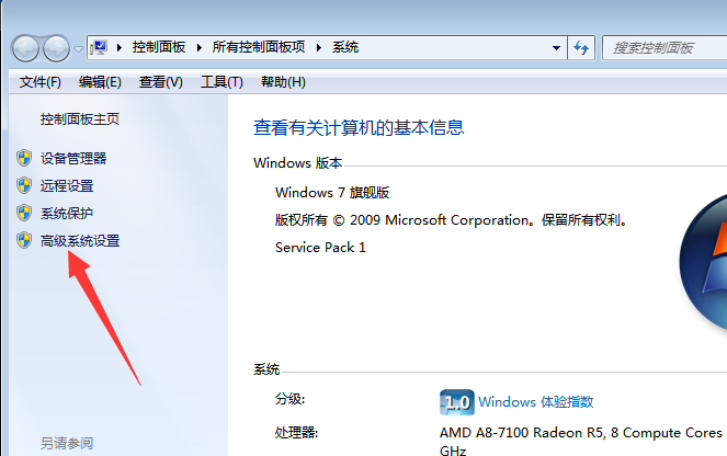 1、首先右键点击“计算机”然后打开“属性”,然后点击“高级系统设置”;
