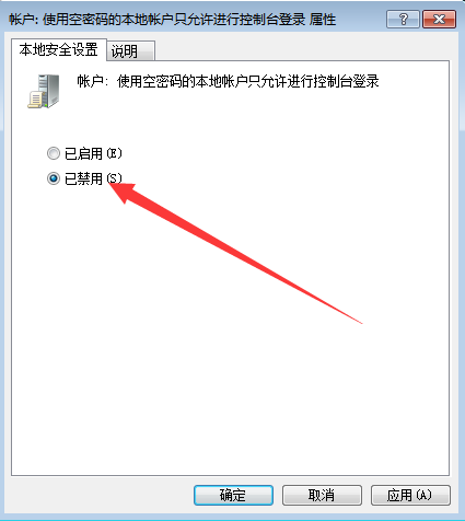 5、在“安全选项”的右侧,找到“账户:使用空白密码的本地账户只允许进行控制台登录”并双击打开,然后在打开的属性窗口中选择“已禁用”,最后点击确定即可。