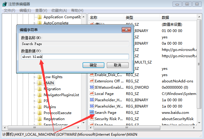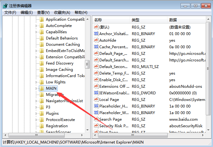 2、打开“注册表编辑器”窗口后,在左侧依次展开“HKEY_LOCAL_MACHINE\SOFTWARE\Microsoft\Internet Explorer\MAIN”;