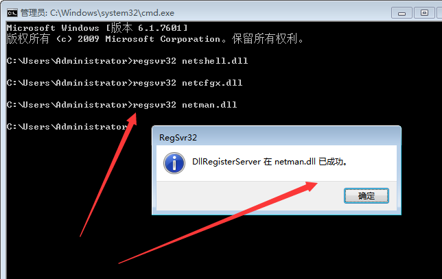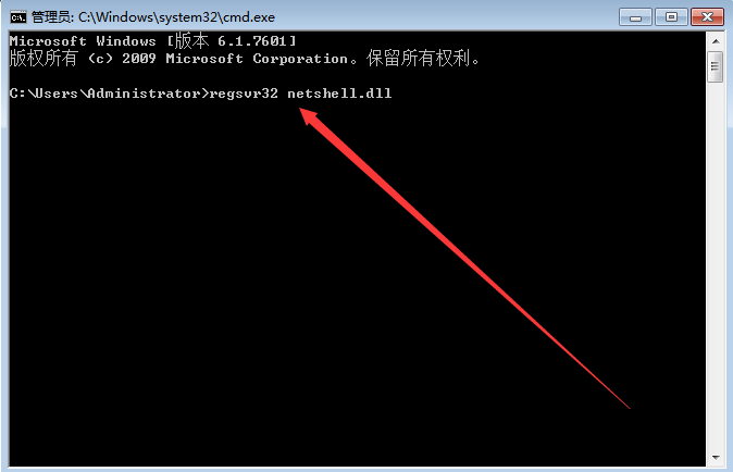 2、打开CMD命令窗口后,输入“regsvr32 netshell.dll”并点击确定进行重新注册;