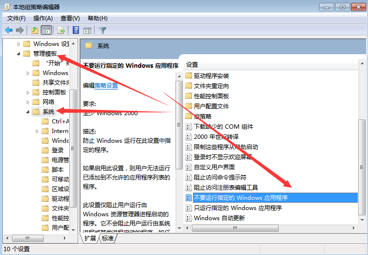 2、在打开的“本地组策略编辑器”窗口中,在左侧窗口依次展开“用户配置--管理模板--系统”,在右侧窗口找到并双击打开“不要运行指定的Windows应用程序”;