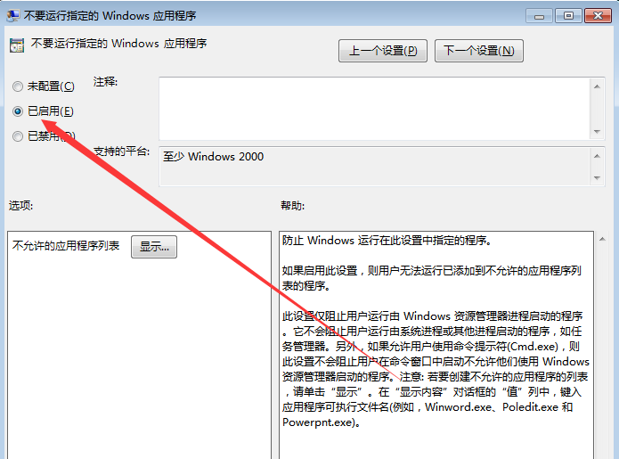 4、来到“显示内容”窗口后,在“不允许的应用程序列表”中双击点击值下面的框,然后输入需要禁止运行的程序全名(包括扩展名),然后点击确定即可。