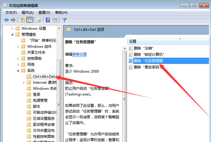 2、来到“本地组策略编辑器”窗口后,在左侧依次展开“用户配置--管理模板--系统--Ctel+Alt+Del选项”,在右侧双击打开“删除任务管理器”;