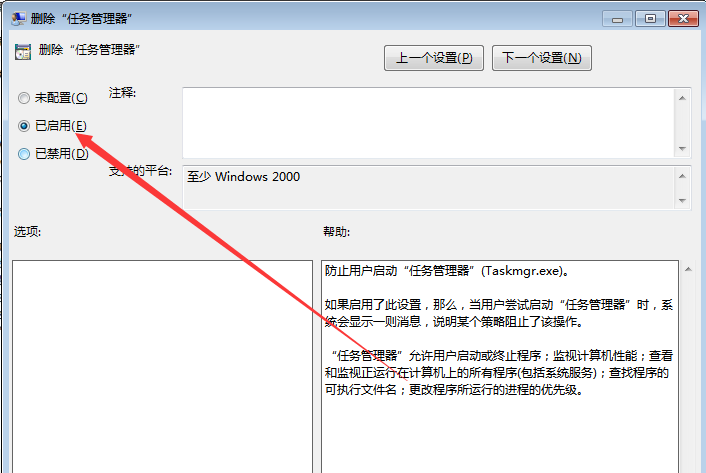 3、来到“删除任务管理器”窗口后,选择“已启用”,最后点击确定即可,相反的如果发现任务管理器打不开了,可以先查看一下这个配置是否已经开启了!
