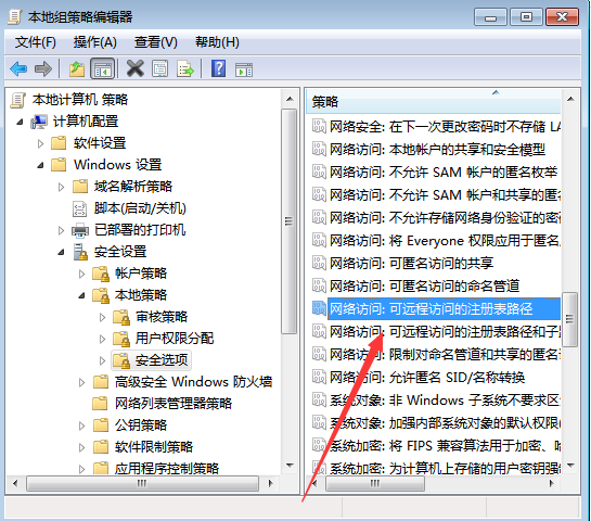 3、在列表中找到“网络访问:可远程访问的注册表路径”,并双击打开;