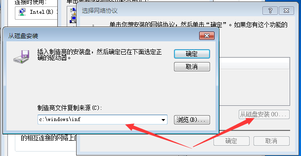 4、选择网络协议界面中,单击“从磁盘安装”。在下方的输入框中输入:C:WINDOWSinf ,单击“确定”,将IPv4和IPv6的协议都安装了
