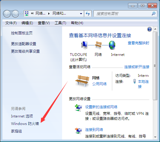 2、网络共享中心左下方导航处有个‘Windows 防火墙’,点击进入。