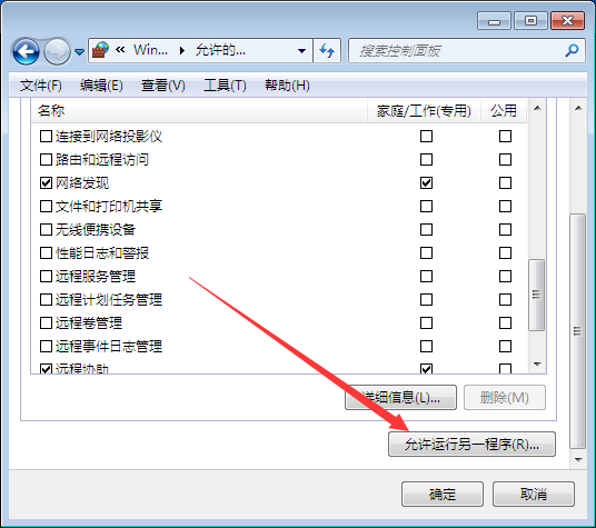 4、在允许的程序和功能下找到需要设置白名单的软件。如果没有,点击‘允许运行另一程序’。
