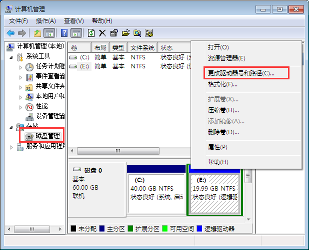 3、在弹出窗口中,选择“存储”---“磁盘管理”,然后在,右侧的第二分区,E盘上右击选择”更改驱动器号和路径“;