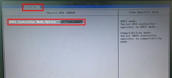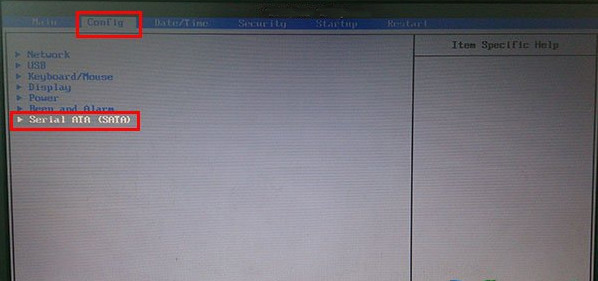 1、重启电脑或者开启电脑,然后在出现开机画面的时候按下对应的快捷键进入到BIOS设置窗口,在BIOS设置窗口中利用键盘上的方向键选择“Config”选项,然后选择“Serial ATA(SATA)”,按下回车键确认,如下图所示: