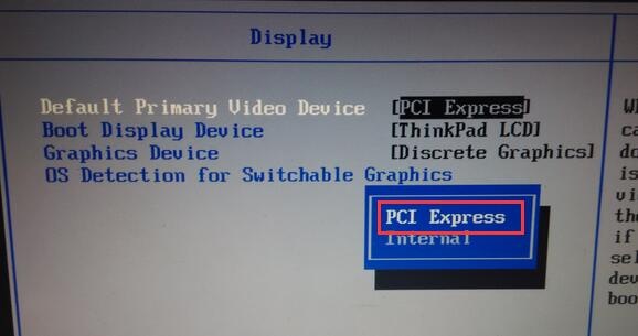 2、接着设置第一项Default Primary Video Device,选择PCI Express(独显)按回车,不选择Internal(集显)。