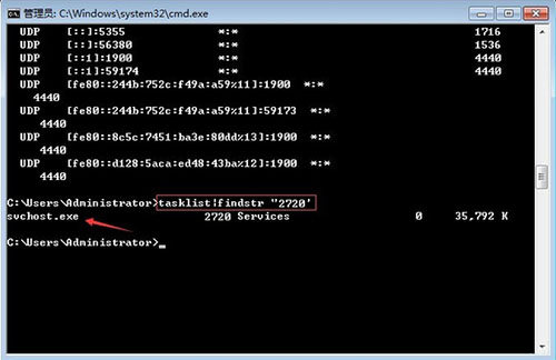 3、这时就可以查看所需要的端口是被什么占用的,我们可看到49457端口被pid为2720的进程占用,接着输入“tasklist|findstr “2720””并按下回车,查询pid为2720的进程名称;如图所示: