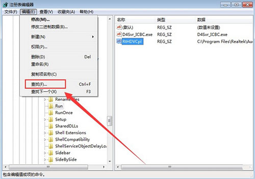 6、除了以上操作可以找到错误项之外,我们还可以点击注册表工具栏上的“编辑”,然后在点击“查找”,如图: