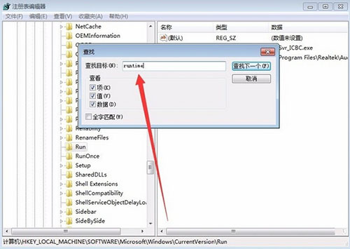 7、在打开的查找设置窗口里中输入runtime,将查看下方的复选框全部勾选上,点击查找就可以查看到了,如图: