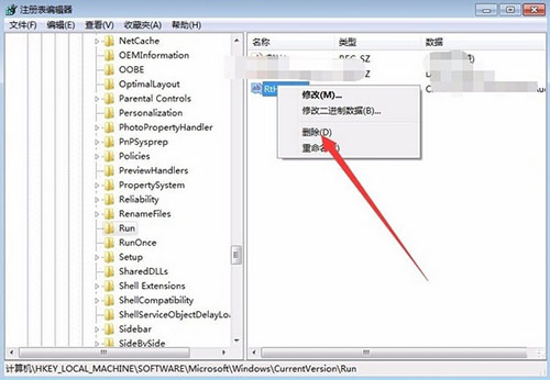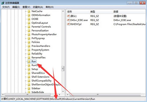 4、打开注册表之后,我们依次定位到【HKEY_LOCAL_MACHINE/SOFTWARE/microsoft/Windows/CurrentVersion/Run】项下,如图: