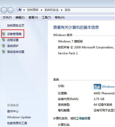 1、右键点击“计算机”—属性,然后在系统信息界面点击“设备管理器”;如图所示: