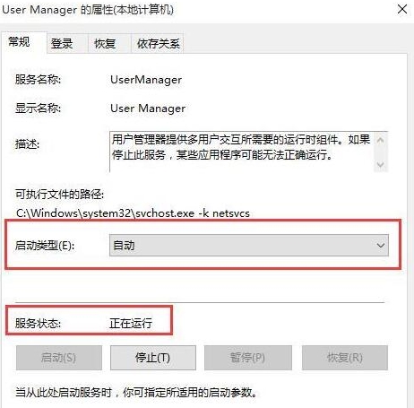 3、最后在user manager属性窗口中,将其启动类型更改为自动,服务状态更改为正在运行,并点击确定保存设置,如图所示: