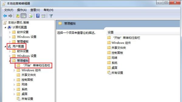 2、在用户配置下找到管理模板,然后找到开始菜单和任务栏,左键选择;