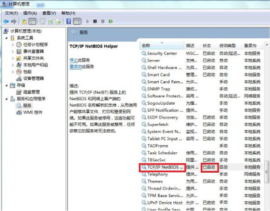 4、在右侧的服务列表中找到TCP/IP NetBIOS Helper这个服务,在状态栏中查看下是否已开启。下图表示未开启。如图所示: