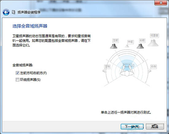 5、在新界面左侧,取消勾选“环绕扬声器”(同样因为 2.1声道并无此设备),进入下一步;如图所示: