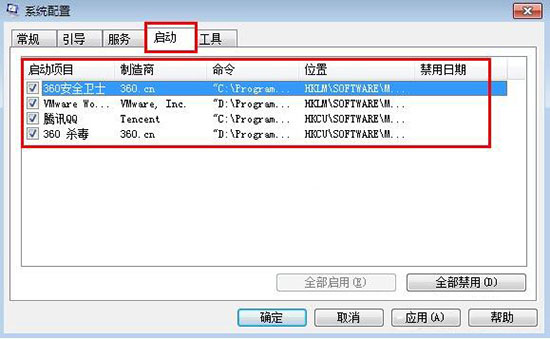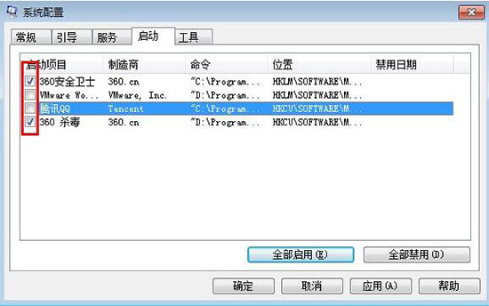 6、这里要注意下,软件前面打钩的表示随机启动,不打钩的表示开机不启动。下图我的QQ没打钩,那么开机时候QQ肯定不会启动。如图所示: