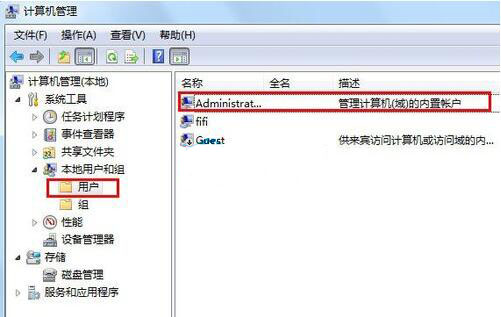 2、在“计算机管理”窗口左侧展开“本地用户和组”目录,点击“用户”文件夹,窗口右侧会列出当前系统中的所有账户。如图所示: