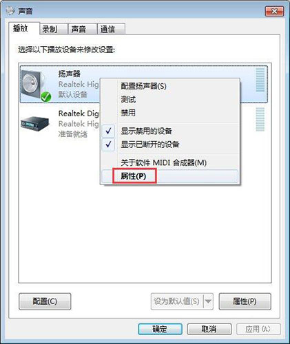 2、之后会弹出“声音”窗口,右键点击扬声器图标打开菜单,选择“属性”,进入属性户切换到“增强”选项卡;如图所示: