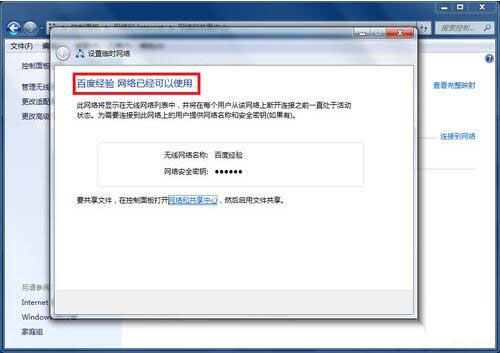 9、等待几秒钟后你就可以看到无线网络设置成功的提示,关闭控制面板,接下来就可以用其他笔记本或者手机连接上网了。如图所示: