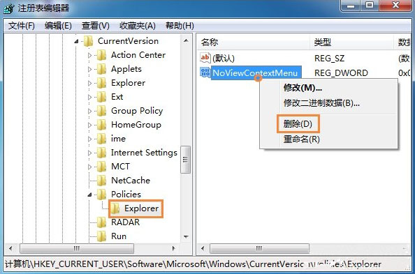 3、单击:Explorer 在Explorer对应的右侧窗口找到:NoViewContextMenu,并右键单击:NoViewContextMenu,在下拉菜单中左键点击:删除;如图所示: