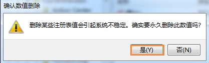4、在弹出的确认数值删除窗口,我们点击:是(Y),退出注册表编辑器,重新启动计算机。如图所示: