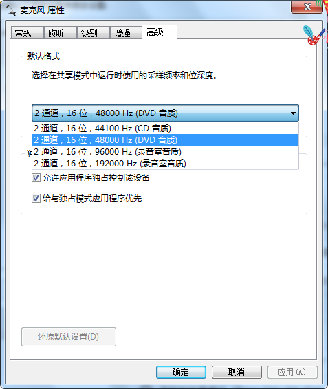 2、在跳出对的“麦克风属性”窗口选择“高级”选项,然后在“默认格式”下,自由选择音质质量(慢慢提升品质,选择到您觉得合适的话,就不用在提高了)如图所示;