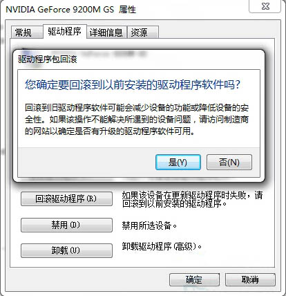 3、切换到“驱动程序”界面,然后点击“滚回驱动程序”,接着在确认对话框中点“是”。如图所示: