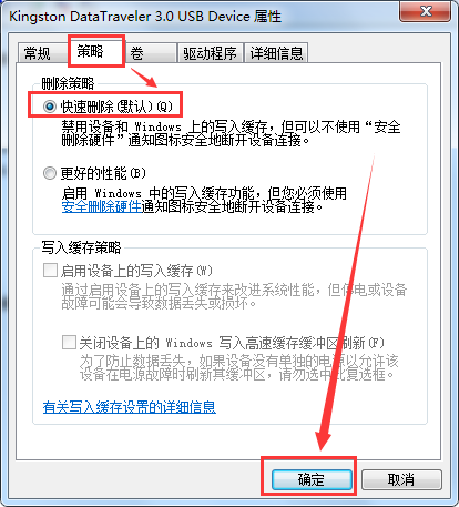 3、找到U盘后,双击选项,进入U盘属性。切换到“策略”选项卡,在“删除策略”选项下,选择“快速删除(默认)”即可。如图所示: