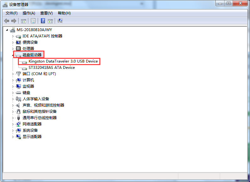 2、 在“设备管理器”窗口找到“磁盘驱动器”并展开,在“磁盘驱动器”下找到您的U盘。如图所示: