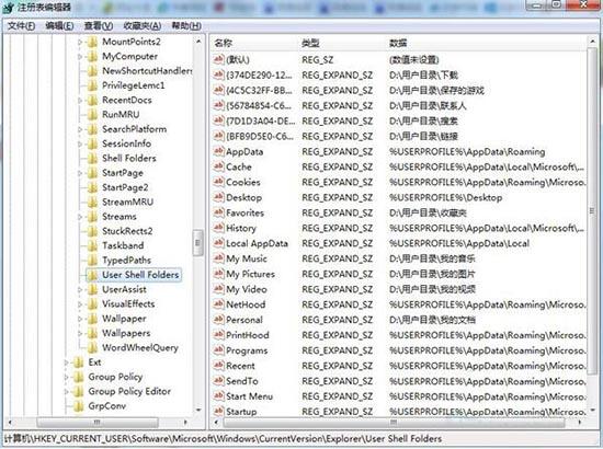 3、进入注册表之后,依次找到[HKEY_CURRENT_USER/Software/Microsoft/Windows/CurrentVersion/Explorer/UserShell Folders]项,如图所示: