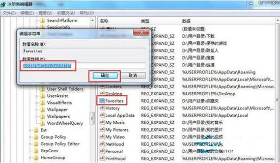 4、在右边的窗口中找到Favorites项,双击 个选项修改数值数据为“%USERPROFILE%\FAVORITES”点击确定,如图所示: