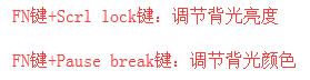 4、同时按下【FN+Scrl lock】组合键即可调节背光亮度,【FN+Pause break】组合键则可以调节背光颜色