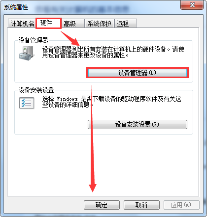 3、在打开的系统属性窗口中,切换到“硬件”选项卡,点击“设备管理器”。如图所示: