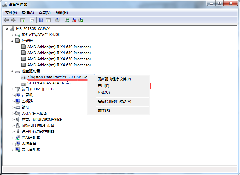 4、在“设备管理器”窗口找到您的U盘,右击鼠标,选择“启动”即可。如图所示: