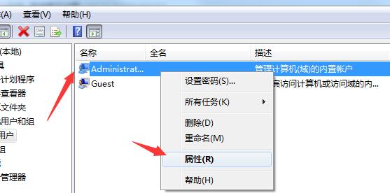 3、右键选择名为【Administrator】的用户,打开属性设置面板