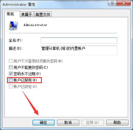 4、取消【账户已禁用】选项勾选,点击确定保存设置