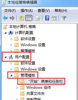 2、依次展开【用户配置-管理模板-“开始”菜单和任务栏】;