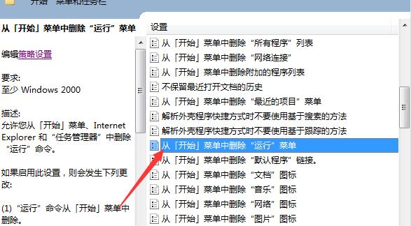 3、找到右栏【从[开始]菜单中删除“运行”菜单】选项并双击打开;