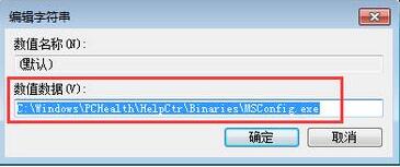 6、修改完名称后选中此项,在右栏窗口中双击打开“默认”值,并清空数值数据的路径,重新输入或粘贴“C:\Windows\PCHealth\HelpCtr\Binaries\MSConfig.exe”,点击确定按钮保存更改。