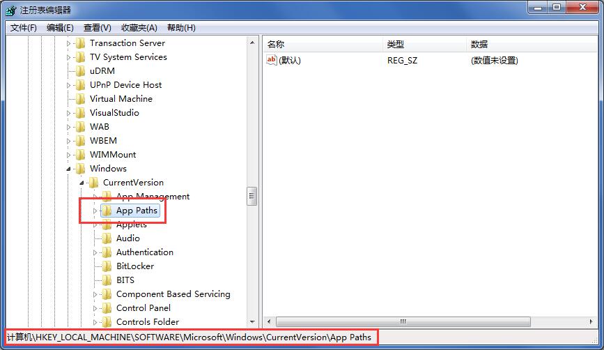 3、根据路径展开“HKEY_LOCAL_MACHINE\SOFTWARE\Microsoft\Windows\CurrentVersion\App Paths”;