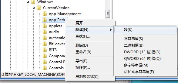 4、右键选中“App Paths”项目,在此目录下新建一个“项”;
