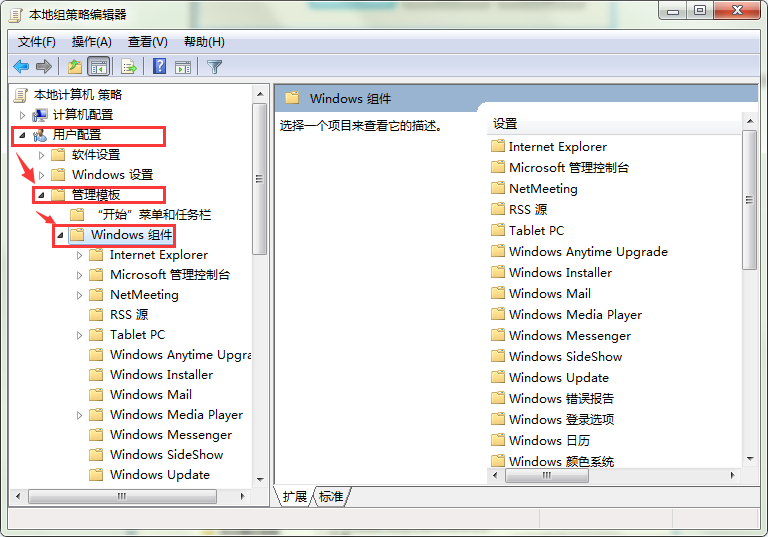 2、打开“本地策略组编辑器”后,选择“用户配置”——“管理模板”——“Windowsz组件”。如图所示: